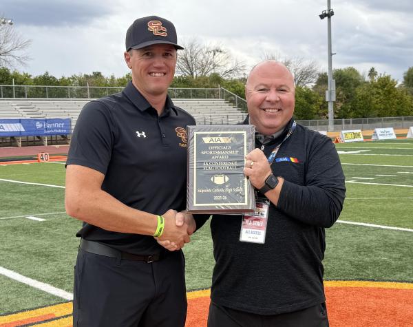 Salpointe head coach Barrie Pedersen accepted the 4A Sportmanship Award from Dr. Jim Dean of the AIA. (Andy Morales/AZPreps365)